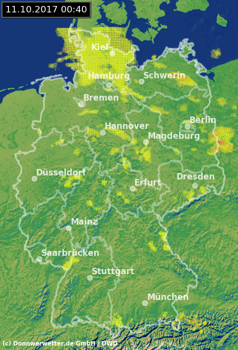 Das Radarbild zeigt aktuell noch örtliche meist leichte Niederschlagssignale. Sonst ist der Himmel über Deutschland meistens wolkenverhangen und nur selten aufgelockert.