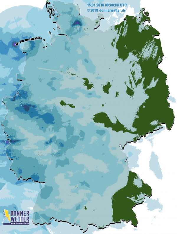 Das Radarbild zeigt aktuell vor allem in der Mitte und im Osten ausgedehnte Signale mit Regen und zum Teil auch Schnee, im Westen gibt es trockene Pausen. Sonst ist der Himmel über Deutschlands meistens wolkenverhangen und nur selten zeigen sich einige Sterne. Der Wind ist gebietsweise lebhaft.