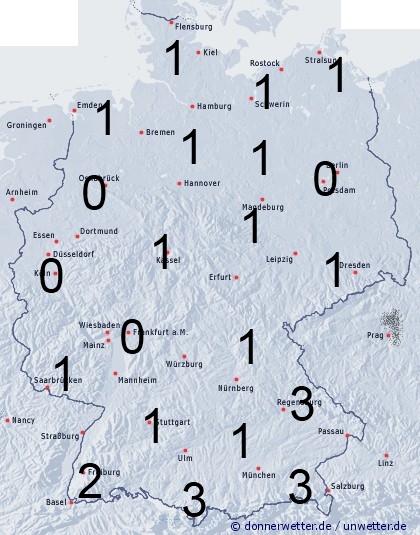 In Folge einzelner örtlicher Gewittergüsse im südlichen Bereich von Deutschland kann es zu einer Benetzungszeit zwischen 1 und 3 Stunden kommen. Sonst entsteht leichte Benetzung nur durch nächtlichen Strahlungstau.