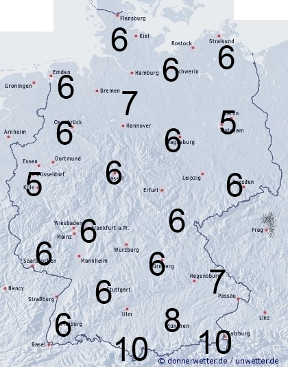 Im südöstlichen Bayern fallen örtlich noch Schauer. Sonst entsteht Benetzung nur durch nächtlichen Strahlungstau. Die Benetzungsdauer liegt dabei allgemein zwischen 5 und 7 Stunden, im südöstlichen Bayern, sowie an den Alpen zwischen 7 und 10 Stunden.