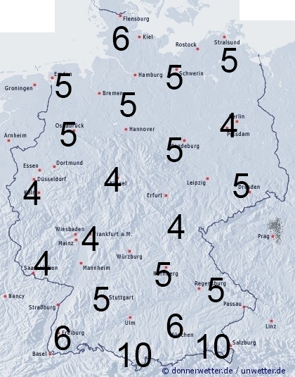 Im Norden fällt gebietsweise etwas Sprühregen. Sonst entsteht Benetzung durch Feuchtigkeit wie Tau- bzw. Reifansatz. Die Benetzungsdauer liegt in Deutschland allgemein zwischen 4 und 10 Stunden. Bei einer noch vorhandenen Schneedecke in den Bergen können bis zu 24 Stunden erreicht werden.
