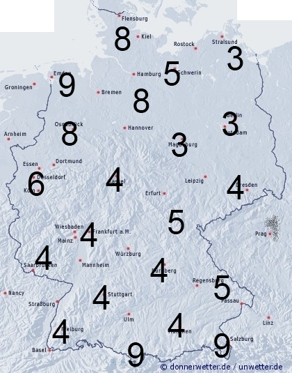 Am Alpenrand kann es noch gelegentlich tröpfeln. Im Nordwesten zieht ein Regenband heran. Sonst entsteht leichte Benetzung durch nächtlichen Strahlungstau. Die Benetzungsdauer liegt allgemein zwischen 3 und 5 Stunden, im Nordwesten, sowie an den Alpen können zwischen 6 und 10 Stunden erreicht werden.
