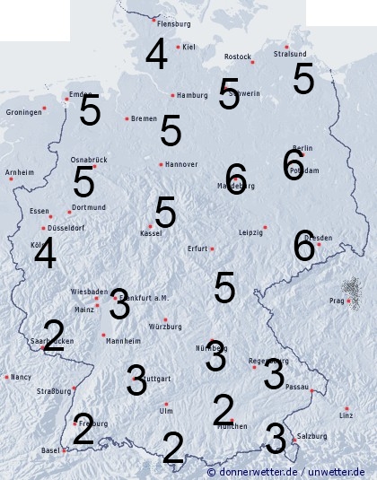 In der Nordhälfte treten Schauer und Gewitter häufiger und intensiver auf als im Süden. Die Benetzungsdauer liegt allgemein zwischen 2 und 6 Stunden.