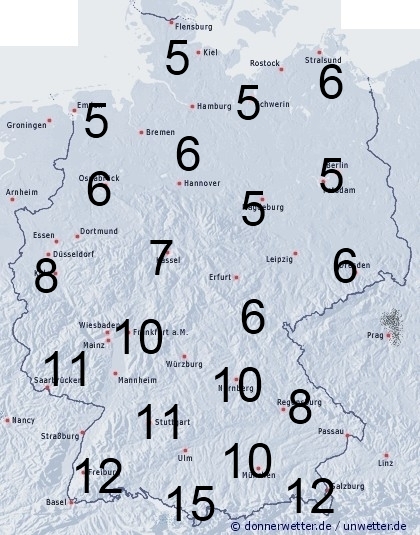 Von Frankreich überquert uns von Südwest nach Nordost im Tagesverlauf das nächste Niederschlagsgebiet. Sonst entsteht Benetzung auch durch nächtlichen Tauansatz oder Reif. Die Benetzungsdauer liegt vor der Regenzone im Norden und Nordosten zwischen 5 und 7 Stunden, im Süden und Südwesten zwischen 8 und 15 Stunden. Bei einer vorhandenen Schneedecke in den Bergen werden bis 24 Stunden erreicht.