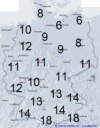 In Deutschland fällt gebietsweise Niederschlag, teils als Regen, teils als Schnee. Im Nordosten bleibt es regional trocken. Sonst entsteht Benetzung durch Feuchtigkeit wie Tau- oder Reifansatz. Die Benetzungsdauer liegt im Nordosten zwischen 6 und 8 Stunden, sonst zwischen 9 und 15 Stunden, an den Alpen können es auch 18 Stunden sein. Bei einer vorhandenen Schneedecke in den Bergen können bis zu 24 Stunden erreicht werden.