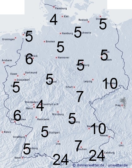 In Bayern und in Sachsen fällt anfangs noch Niederschlag, sonst ist es überwiegend trocken. Gegen Abend zieht im Westen etwas Regen auf. Sonst entsteht Benetzung durch Feuchtigkeit. Die Benetzungsdauer liegt in Deutschland allgemein zwischen 4 und 7 Stunden, im Erzgebirge und im Bayrischen Wald auch bei 10 Stunden. Bei einer vorhandenen Schneedecke in den Bergen können bis zu 24 Stunden erreicht werden.