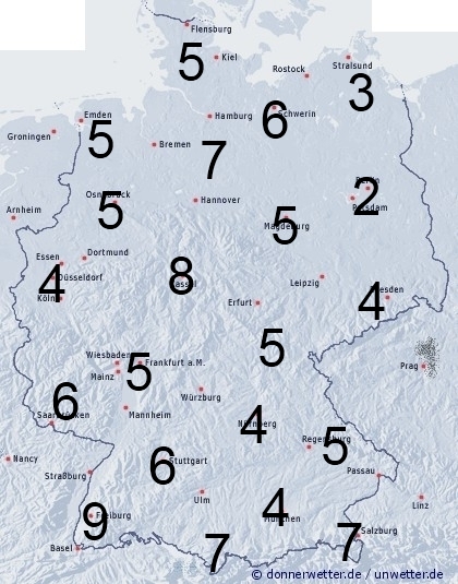 In der wärmeren Luft bilden sich vor allem in einem Streifen vom Saarland bis zur Ostsee wieder örtliche Regengüsse und Gewitter. Sonst entsteht leichte Benetzung durch nächtlchen Strahlungstau. Die Benetzungsdauer liegt allgemein in Deutschland zwischen 2 und 5 Stunden. Bei auftretenden Regenschauern, sowie in Alpentälern können 5 bis 9 Stunden erreicht werden.