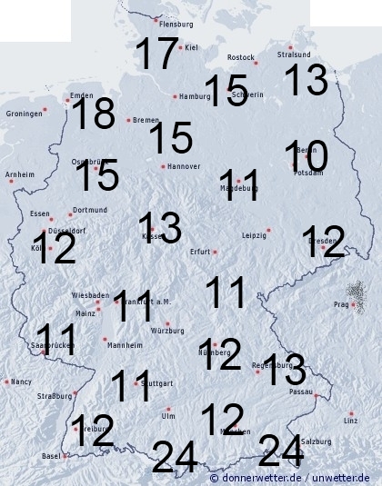 Im Nordwesten setzt neuer Regen ein. Sonst entsteht Benetzung durch Feuchtigkeit wie Tau- oder Reifansatz. Die Benetzungsdauer liegt in Deutschland allgemein zwischen 10 und 13 Stunden, bei Regen im Nordwesten zwischen 13 bis 18 Stunden und bei einer vorhandenen Schneedecke werden 24 Stunden erreicht.