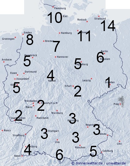 Im Norden kann es längere Zeit regnen, daher erreicht hier die Benetzungdsauer auch gebietsweise zwischen 7 und 14 Stunden. Sonst treten gelegentliche Schauer auf und sorgen für eine Benetzungsdauer von meist 1 bis 6 Stunden.
