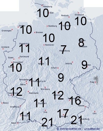 In Deutschland fällt Regen, oder es treten Schauer auf. Vor allem südlich der Donau regnet es auch länger anhaltend. In Gebieten Ostdeutschlands bleibt es zum Teil auch trocken. Hier entsteht Benetzung durch Tau. Die Benetzungsdauer liegt allgemein zwischen 9 und 12 Stunden. Dort, wo es trocken bleibt liegt sie darunter, bei Dauerregen werden zwischen 16 und 21 Stunden erreicht.