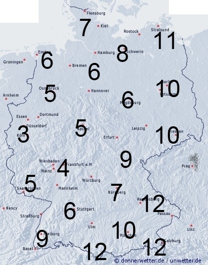 Vor allem im Osten und Süden treten vermehrte Schauer und Gewitter auf, in den übrigen Bereichen eher nur vereinzelt bis örtlich. Sonst entsteht leichte Benetzung durch nächtlichen Strahlungstau. Die Benetzungsdauer liegt in Deutschland allgemein zwischen 3 und 5 Stunden, bei Schauern zwischen 5 und 12 Stunden.
