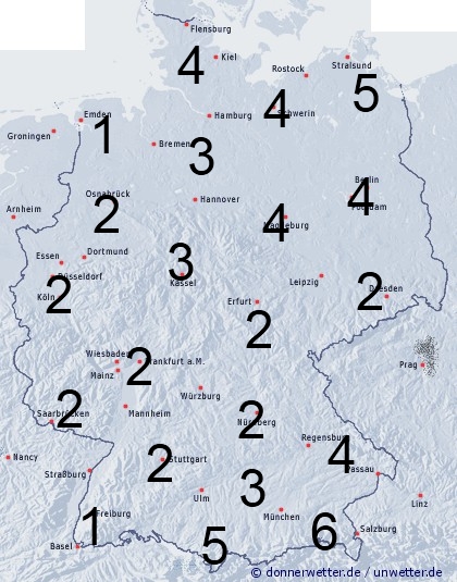 In Deutschland muss mit dem Durchzug von Regengüssen gerechnet werden. Daher kann die Benetzungsdauer zwischen 2 und 6 Stunden erreichen. Trocken bleibt es wahrscheinlich im Breisgau und im Emsland. Leichte Benetzung kann durch nächtlichen Strahlungstau entstehen.