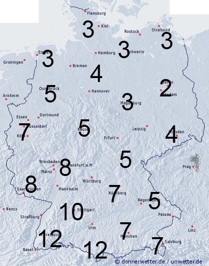Im Süden und Westen kann es regional zu teils kräftigen Regengüssen und Gewittern kommen. Sonst entsteht leichte Benetzung nur durch nächtlichen Strahlungstau. Die Benetzungsdauer liegt allgemein zwischen 2 und 4 Stunden, im Süden und Südwesten können bedingt durch Regengüsse zwischen 5 und 12 Stunden erreicht werden.