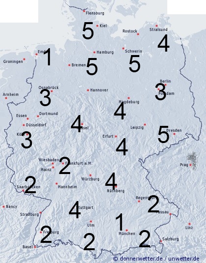 Eine von Westen heranziehende Front löst vermehrt Schauer und Gewitter aus. Die Benetzungsdauer kann dabei allgemein zwischen 2 und 5 Stunden erreichen. Sonst entsteht leichte Benetzung nur durch nächtlichen Strahlungstau.