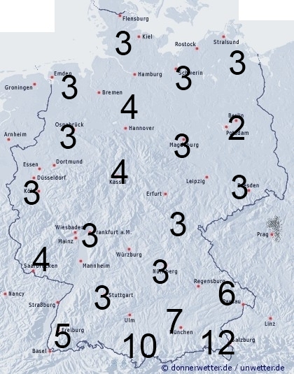 Im Alpenvorland muss vermehrt mit Regengüssen gerechnet werden, sonst treten Schauer eher selten auf. Benetzung entsteht aber auch durch nächtlichen Stralhlungstau. Die Benetzungsdauer liegt allgemein zwischen 2 und 6 Stunden, im Alpenvorland können aber auch 7 bis 12 Stunden erreicht werden.