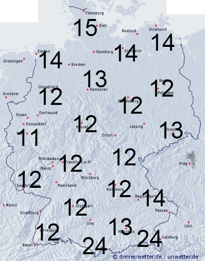 Im Norden kann es im Tagesverlauf etwas tröpfeln oder nieseln. Sonst entsteht Benetzung durch Tau oder Reif. Die Benetzungsdauer liegt dabei allgemein zwischen 11 und 15 Stunden. Bei einer vorhandenen Schneedecke in den Bergen werden 24 Stunden erreicht.