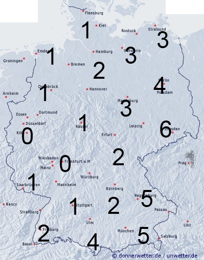 Vor allem im Osten und am Alpenrand treten teils gewittrige Schauer auf. Daher erreicht die Benetzungsdauer hier allgemein zwischen 2 und 6 Stunden. Sonst entsteht leichte Benetzung nur durch einzelne schwache Schauer, oder nächtlichen Strahlungstau.