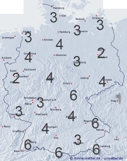 Regengüsse und Gewitter treten in Deutschland nur noch selten auf. Leichte Benetzung entsteht auch durch nächtlichen Strahlungstau. Die Benetzungsdauer liegt allgemein zwischen 2 und 6 Stunden.