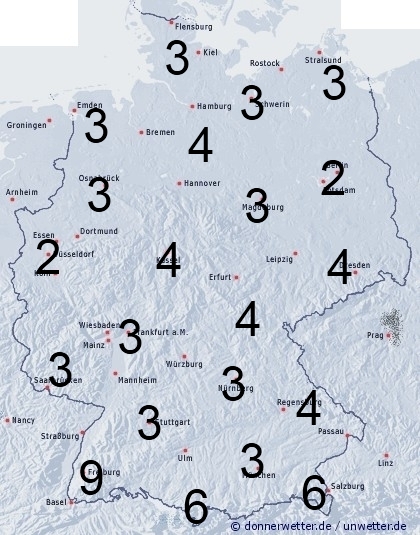 Im Schwarzwald muss gebietsweise mit örtlichen Schauern und Gewittern gerechnet werden. Sonst entsteht leichte Benetzung durch nächtlichen Strahlungstau. Die Benetzungsdauer liegt allgemein in Deutschland zwischen 2 und 4 Stunden. Bei auftretenden Schauern können zwischen 5 und 9 Stunden erreicht werden.