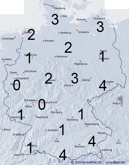 Es herrscht in der Regel niedrige Benetzung. Nur bei etwas Regen oder örtlichen Schauern können bis zu 4 Stunden erreicht werden.