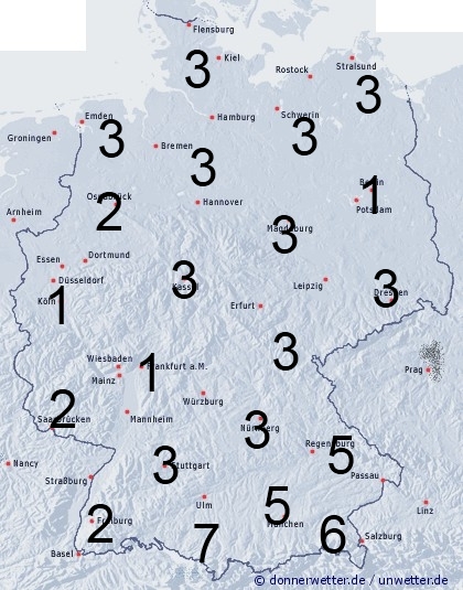 Im östlichen Baden-Württemberg, in Teilen Bayerns, sowie an den Alpen kann es zu Schauern und Gewittern kommen. Daher erreicht hier die Benetzungszeit zwischen 5 und 7 Stunden. Sonst entsteht Benetzung durch nächtlichen Strahlungstau.