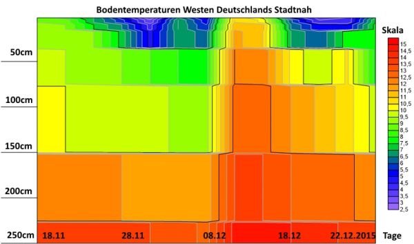 Bodentemperaturen vom 18.11.2015 bis zum 22.12.2015, für den Westen Deutschlands.