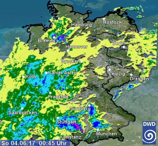 Das Radarbild zeigt aktuell ein von Frankreich heranziehendes umfangreiches Regengebiet, das schon den gesamten Südwesten Deutschlands abdeckt und bereits in die Mitte des Landes vorgedrungen ist. Außerdem sind im Süden noch regionale Gewitterzellen mit Starkregen aktiv. Eine weitere Gewitterzelle nähert sich der Hansestadt Hamburg. Lediglich in der Osthälfte ist es größtenteils trocken.