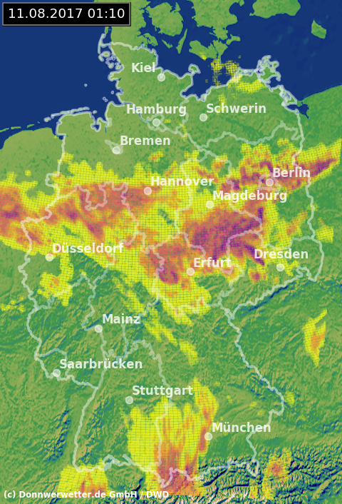 Heute kann es gebietsweise zu teils kräftigen Regenfällen, örtlich auch Gewittern mit Niederschlagsmengen von stellenweise über 50 Liter pro Quadratmeter kommen. Dabei drohen lokal auch wieder Überschwemmungen, sowie Aquaplaning. Überwiegend trocken bleibt es im Rheinland, sowie im Küstenbereich von Nord- und Ostsee.