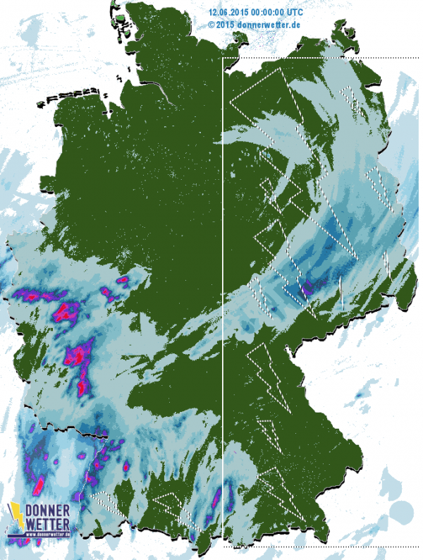 Gestern gab es besonders kräftige Gewitter im Westen. Zwischen dem südlichen Niedersachsen und dem Schwarzwald gab es lokal bis zu 50 l/m2. Heute treffen die Gewitter in Ostdeutschland und in Bayern ein. Informieren Sie sich im Radarbild über die Bewegung der Gewitter.