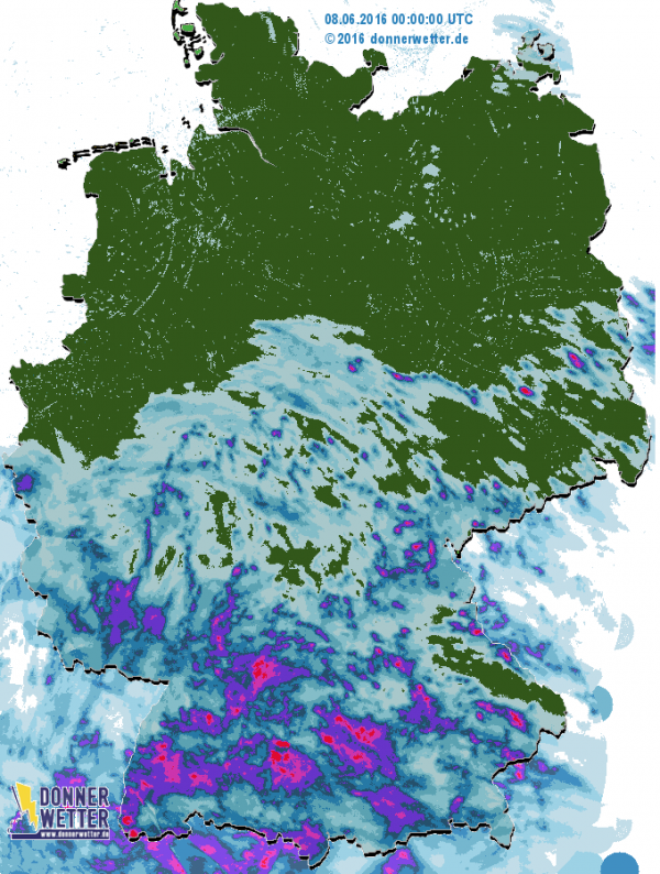 Von Norden her setzt sich trockene Luft in Deutschladn durch. Größere Regenmengen gab es nur in den Mittelgebirgen bis zu den Alpen. Teilweise wurden bis zu 50 l/m2 wieder in einzelnen Gewittern beobachtet, besonders rund um den Schwarzwald und der Alb.