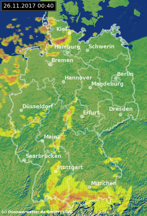 Das Radarbild zeigt aktuell im Süden zum Teil noch stärkere Niederschlagssignale. Hier fällt teils Regen, teils Schnee, desweiteren erkennt man örtliche Schauersignale, die vor allem über der Nordsee und in Schleswig-Holstein stärker ausgeprägt sind. Sonst ist der Himmel über Deutschland teils wolkenverhangen, teils aufgeklart. Stellenweise haben sich Nebelfelder gebildet.