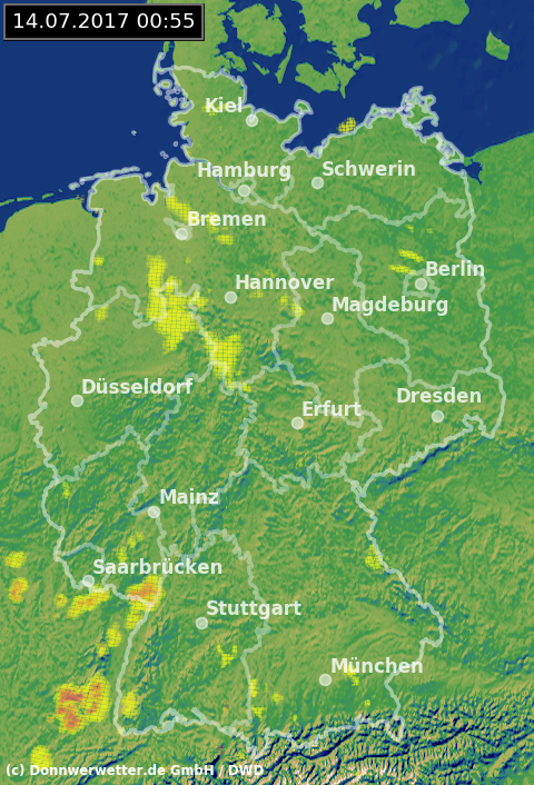 Heute können sich im Süden gelegentliche Regengüsse, zum Teil mit Blitz und Donner bilden. Auch in anderen Gebieten ziehen tagsüber örtliche Schauer und Gewitter übers Land. Die Niederschlagsmengen können örtlich über 10 Liter pro Quadratmeter erreichen. Stellenweise bleibt es jedoch auch trocken.