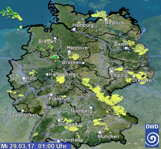 Das Radarbild zeigt zwar momentan schwache Signale. Etwas Regen fällt jedoch nur aus den etwas dunkleren Echos südwestlich und südlich von Bremen, sowie über der Nordsee. Sonst ist der Himmel über Deutschland meist nur leicht bewölkt oder sogar wieder wolkenlos.