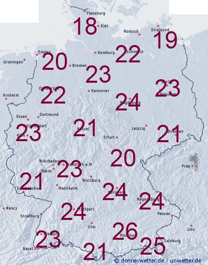 Mit abkühlender Luft sinken auch die Temperaturen unterhalb der Krume. Ganz im Norden, sowie in den Mittelgebirgen liegen die Temperaturen bereits unterhalb der 20 Grad - Marke. Sonst werden allgemein zwischen 20 und 24 Grad gemessen, in Bayern teillweise auch noch über 25 Grad.