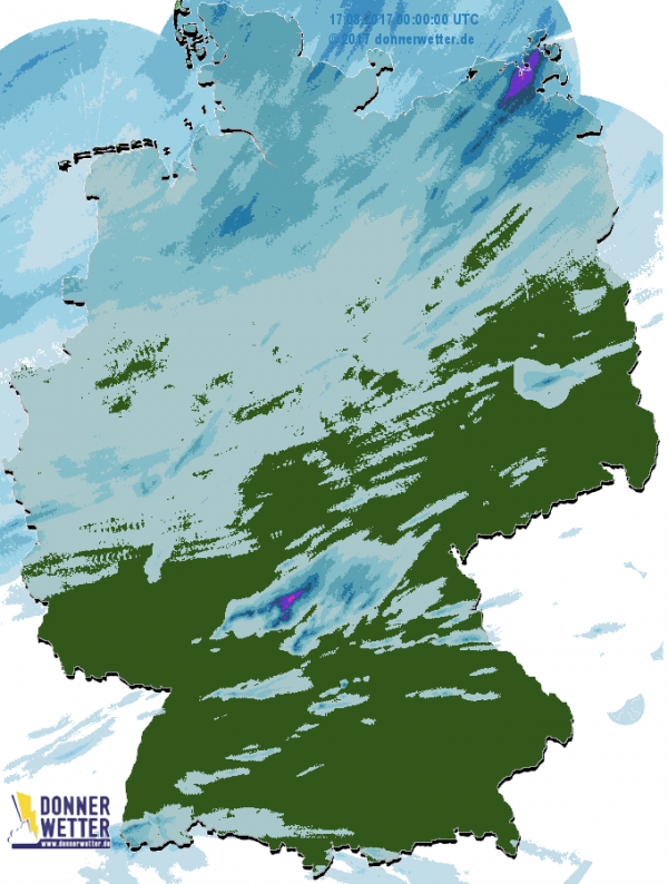 Das Radarbild zeigt aktuell allmählich nach Polen abziehende, aber gleichzeitig von Südwesten heranrückende neue Regensignale. Sonst ist der Himmel über Deutschland eher bewölkt und nur gebietsweise aufgeklart.