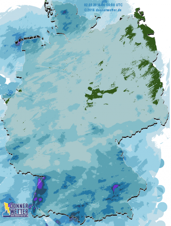 Auf dem Regenradar sind die Regenmengen des Tiefs von gestern zu sehen. Bis zu 10 l/m2 fielen im Flachland. Im Schwarzwald und an den Alpen gab es deutlich mehr Niederschlag.