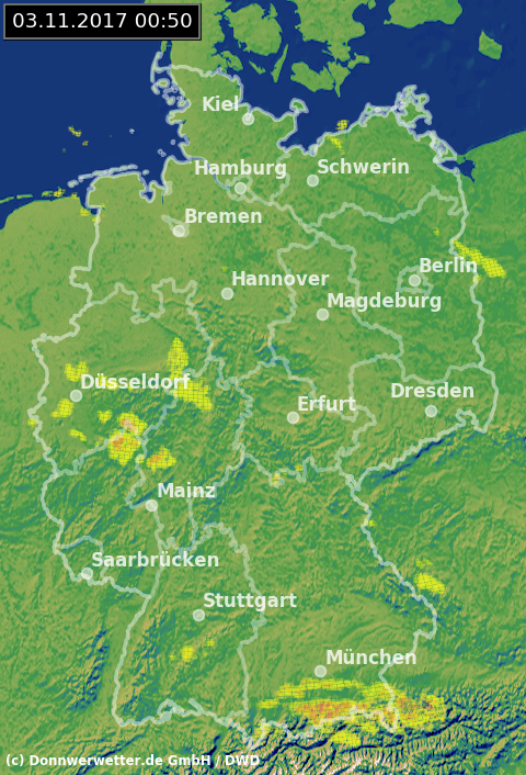 Das Radarbild zeigt aktuell vor allem im Westen und in Südbayern einige Niederschlagssignale. Sonst ist der Himmel über Deutschland überwiegend wolkenverhangen und nur gebietsweise aufgeklart. Vor allem im Nordwesten haben sich Nebelfelder gebildet. Die Temperaturen liegen aktuell zwischen 4 und 12 Grad.