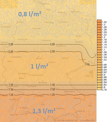 Heute tagsüber regnet es zunächst noch in der Osthälfte von Mecklenburg-Vorpommern, über Sachsen, bis in Teile Bayern. Dabei können Niederschlagsmengen zwischen 5 und 10 Liter pro Quadratmeter erreicht werden. Im Bereich der Oder bleibt es aber wohl trocken. Im übrigen Land stellt sich eine vorübergehende Wetterberuhigung ein, bevor in der Nacht auf Montag das nächste Regengebiet den Nordwesten unseres Landes erreicht, das uns dann von Montag auf Dienstag mit teils lebhaftem Wind überqueren wird. Dabei können gebietsweise wieder zwischen 10 und 30 Liter Regen pro Quadratmeter nieder prasseln.