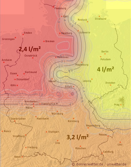 Den Westen erreichten hingegen am Nachmittag erste Ausläufer eines Tiefs über dem Atlantik. Diese "arbeiteten" sich im Lauf des Abends und der ersten Nachthälfte bis auf die Höhe von Magdeburg und Nürnberg vor. Die höchsten Niederschlagsmengen wurden dabei im äußersten Westen zwischen der dänischen Grenze und dem Niederrhein erzielt. Hier kamen bis Mitternacht 10 bis 20 Liter Niederschlag pro Quadratmeter zusammen.
