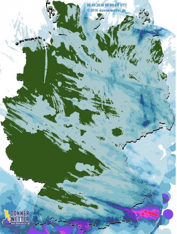 Dabei fielen verbreitet um die 5 Liter Regen pro Quadratmeter, in der Lausitz und Uckermark lokal bis zu 20 Liter und im Allgäu und Berchtesgadener Land sogar bis zu 35 Liter.
