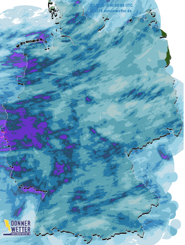 Langanhaltenden Regen mit Niederschlagsmengen bis 35 l/m² verzeichneten am Montag vor allem die aufzeichnenden Stationen im Westen Deutschlands. Besonders nass zeigte sich dabei die Region zwischen Niederrhein und Taunus.