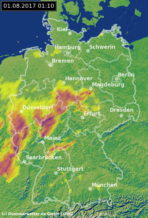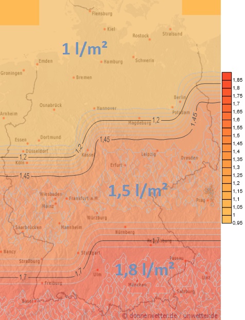 Heute sorgt die sich über Deutschland befindende Luftmassengrenze zum Teil für kräftige Schauer und Gewitter. Die Niederschlagsmengen können örtlich über 25 Liter pro Quadratmeter erreichen, vereinzelt auch über 50 Liter pro Quadratmeter. Dabei muss mit kleinräumigen Überflutungen gerechnet werden. In der Südosthälfte können die Temperaturen über 35 Grad klettern.