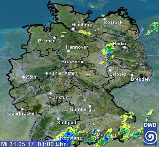 Das Radarbild zeigt aktuell vor allem südlich der Donau noch einige Schauer- und Gewittersignale. Auch südwestlich von Berlin ist noch ein größeres Schauerecho zu erkennen. Sonst ist der Himmel über Deutschland teils bewölkt, teils klar. Stellenweise haben sich in der feuchten Luftmasse nach einem Gewitterregen Nebelfelder gebildet.