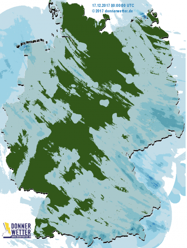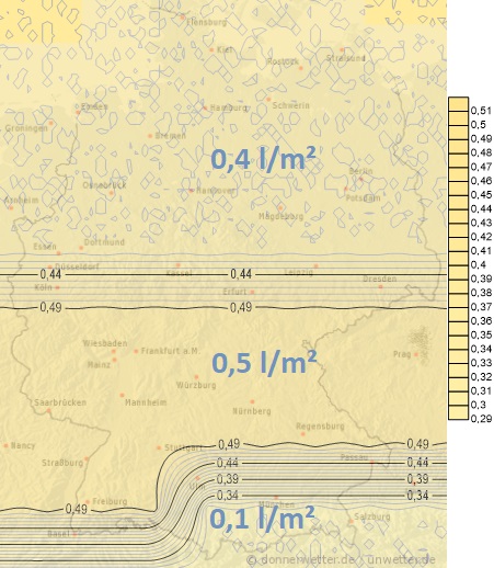 Am Dienstag stößt von Norden neuer Niederschlag nach. Dieser fällt im Süden, sowie in in den Mittelgebirgen überwiegend als Schnee, sonst meistens als Regen. Die Niederschlagsmengen liegen dabei zwischen 1 und 10 Liter pro Quadratmeter.
