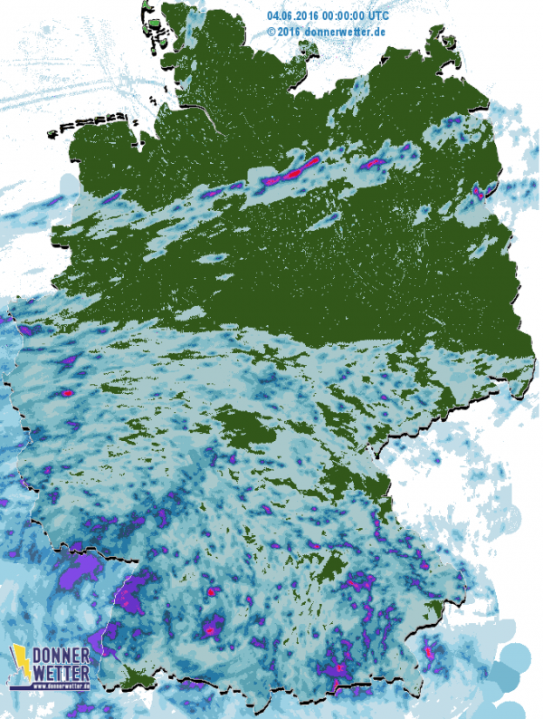 Deutlich ist die Zweiteilung im 24 Stunden-Regenradarbild zu sehen. Der Norden blieb meist trocken, wobei es hier lokal auch zu Gewitterbildung kam. In der Mitte und im Süden war es nass und teilweise gab es wieder Regenmengen von über 50 l/m2, die zu Problemen führten, wie z.B. in Bonn Bad Godesberg, in Niederbayern, im Nürnberg Raum.