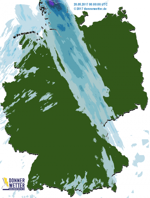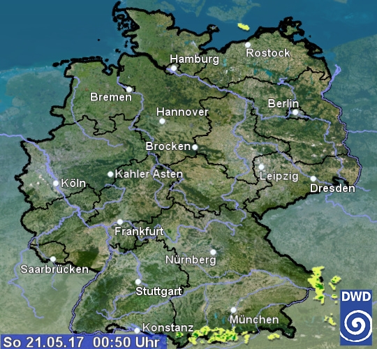 Das Radarbild zeigt aktuell am Alpenrand und bei Passau einige Signale. Hier fällt momentan noch etwas Regen. Sonst ist der Himmel in Deutschland teils bewölkt, teils sternenklar.