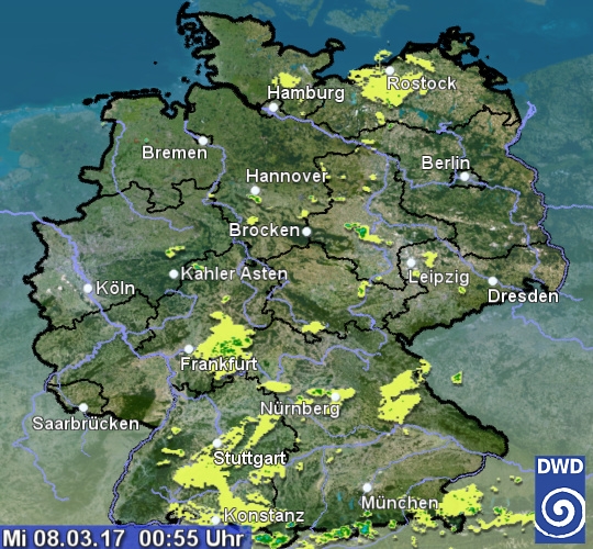 Das Radarbild zeigt noch einige meist schwächere Niederschlagsechos über Deutschland verteilt. Hier fällt zum Teil noch etwas Regen, beziehungsweise es gehen noch leichte Schauer nieder. An den Alpen fällt noch etwas Schnee. Vor allem im Westen hat der Himmel aufgeklart.