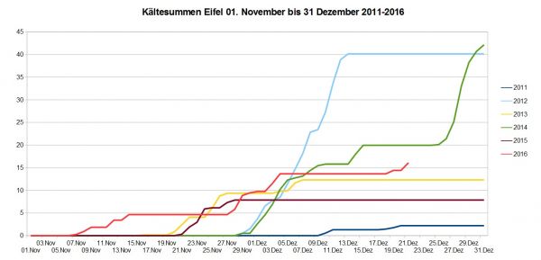 Ähnlich sieht die Lage in den Mittelgebirgen aus. Nach einem regelrechten "Frühstart" Anfang November ernährte sich die Kältesumme in den letzten Wochen nur mühsam, bevor in den letzten Tagen wieder rund 2 Grad hinzu addiert wurden. Die Winter 2012 und 2014 sind längst vorbeigezogen und die nächste Kälteperiode ist noch nicht in Sicht.