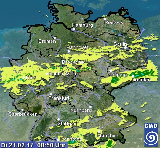 Das Radarbild zeigt momentan eine quer über Deutschland liegende Niederschlagszone. Sie gehört zu einer Kaltfront, die allmählich nach Südosten wandert und verbreitet für leichten bis mäßigen Regen sorgt. Sonst gibt es über Süddeutschland schwache Echos mit leichtem Regen oder Sprühregen. Im Norden ist es hinter der Front meistens trocken. Aber auch hier können bis zum Morgen noch schwache Echos von der Nordsee hereinziehen.