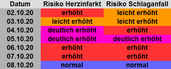 Nicht folgenlos wirkt sich die regional wechselhafte und windige Witterung sowie Temperaturschwankungen auf die Herzinfarkt- und Schlaganfallrisiken aus. Erst zum Ende der kommenden Woche nehmen die Risiken wieder deutlich ab.